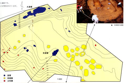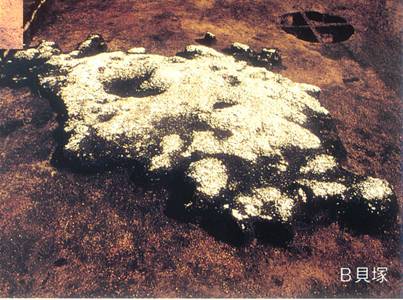貝塚は大型のA貝塚が北斜面に、小型のB貝塚が住居群の近くに構築されています。