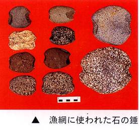 縄文時代前期の特徴は、水産資源の利用が活発になることと、植物性食料が豊富になり、それを利用する技術が発展する。銛、錘などの漁労活動を裏付ける石器や堅果類や植物繊維を磨り潰すために使われたすり石や石皿が多く出土しています。